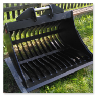 Prosévací lžíce šíře 90 cm. Vhodná k těžení, ale primárně určená k třídění jakékoliv zeminy, která je zanesená kamenem, stavební sutí, kořeny a poddobným nežádoucím odpadem. Mezery v roštu 6cm tedy frakce zhruba 0-6. Ale také je vhodným pomocníkem při strhávání chodníků ze žuly nebo zámkové dlažby a také umí vyčisti koryta řek, vodní plochu atd. aniž by se zbytečně vynášela voda.