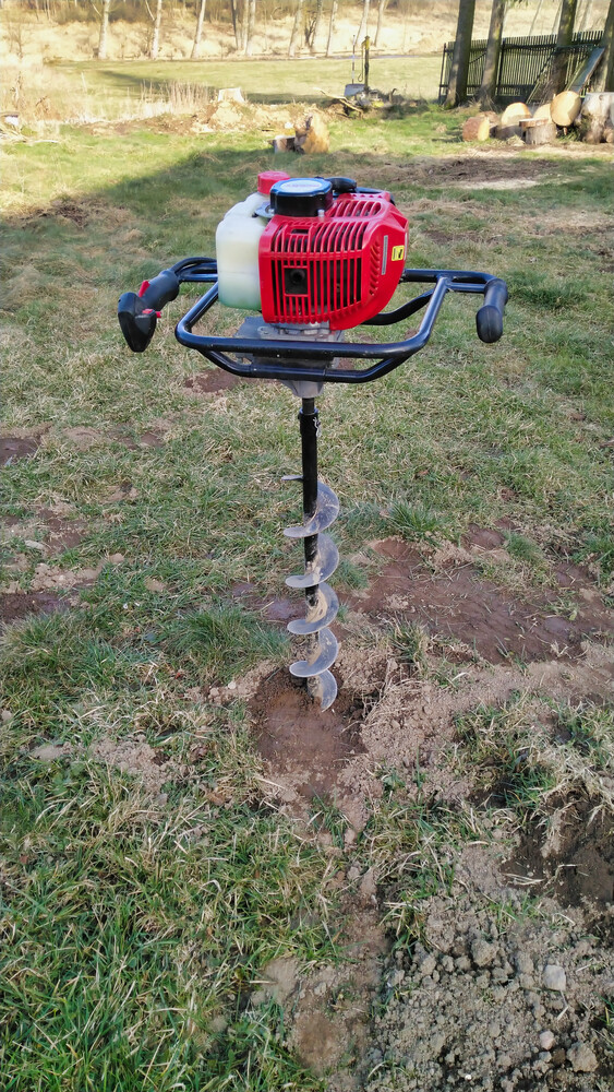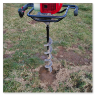 Motorový zemní vrták s dvoutaktem na benzín, vedený ručně je schopen vrtat díry metr hluboké a k dispozici jsou vrtáky 100mm, 150mm, 250mm.